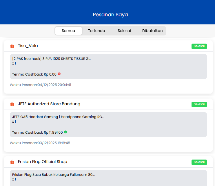 History PesananLangkah-langkah melihat history pesanan Klik tombol Pendapatan. Masuk ke Pesanan Saya. Pendapatan SaldoPrevious PagePenarikan CashbackNext Page